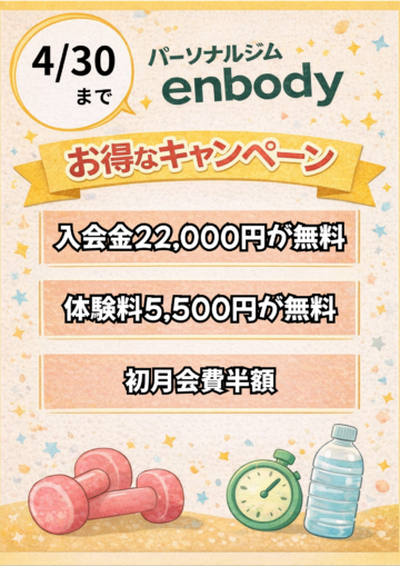 | 対象 | 期間中にenbody恵比寿店に体験後、ジム内にてご入会の方 |